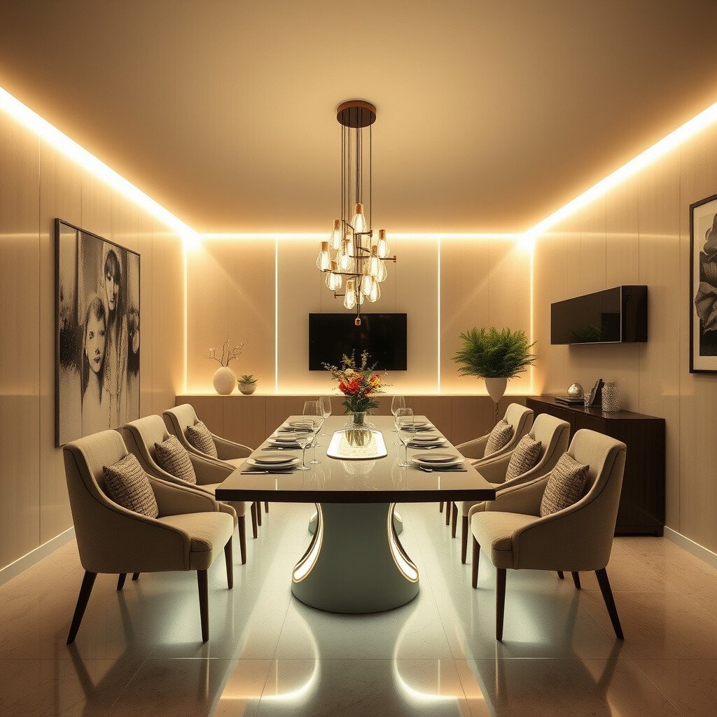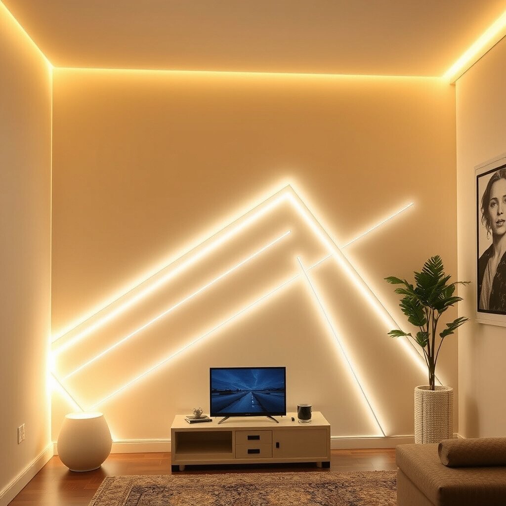 Use warm white LED strips to create artistic accents on your walls. This can be a simple line design or a complex geometric pattern.