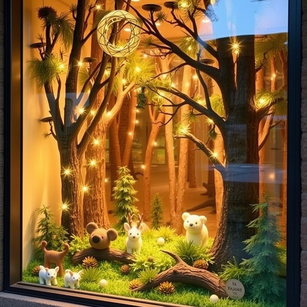 Bring the mystical woods to your window with an enchanted forest theme. Use faux trees, woodland creatures, and twinkling lights. This magical setup invites wonder and awe.