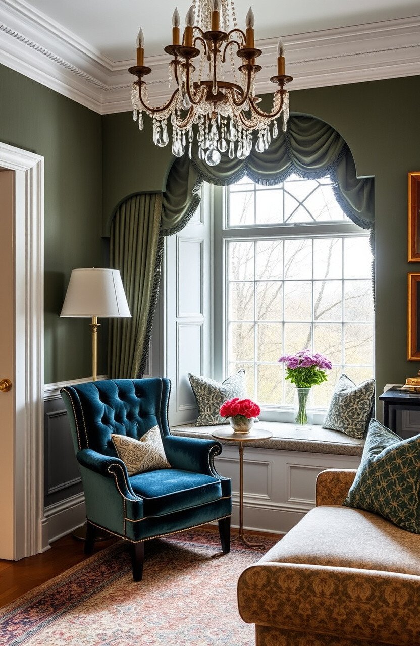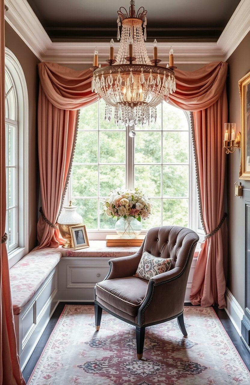 Vintage glam features luxurious fabrics and elegant decor. A velvet chair and crystal chandelier add sophistication.