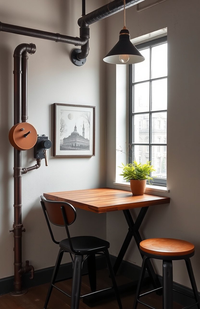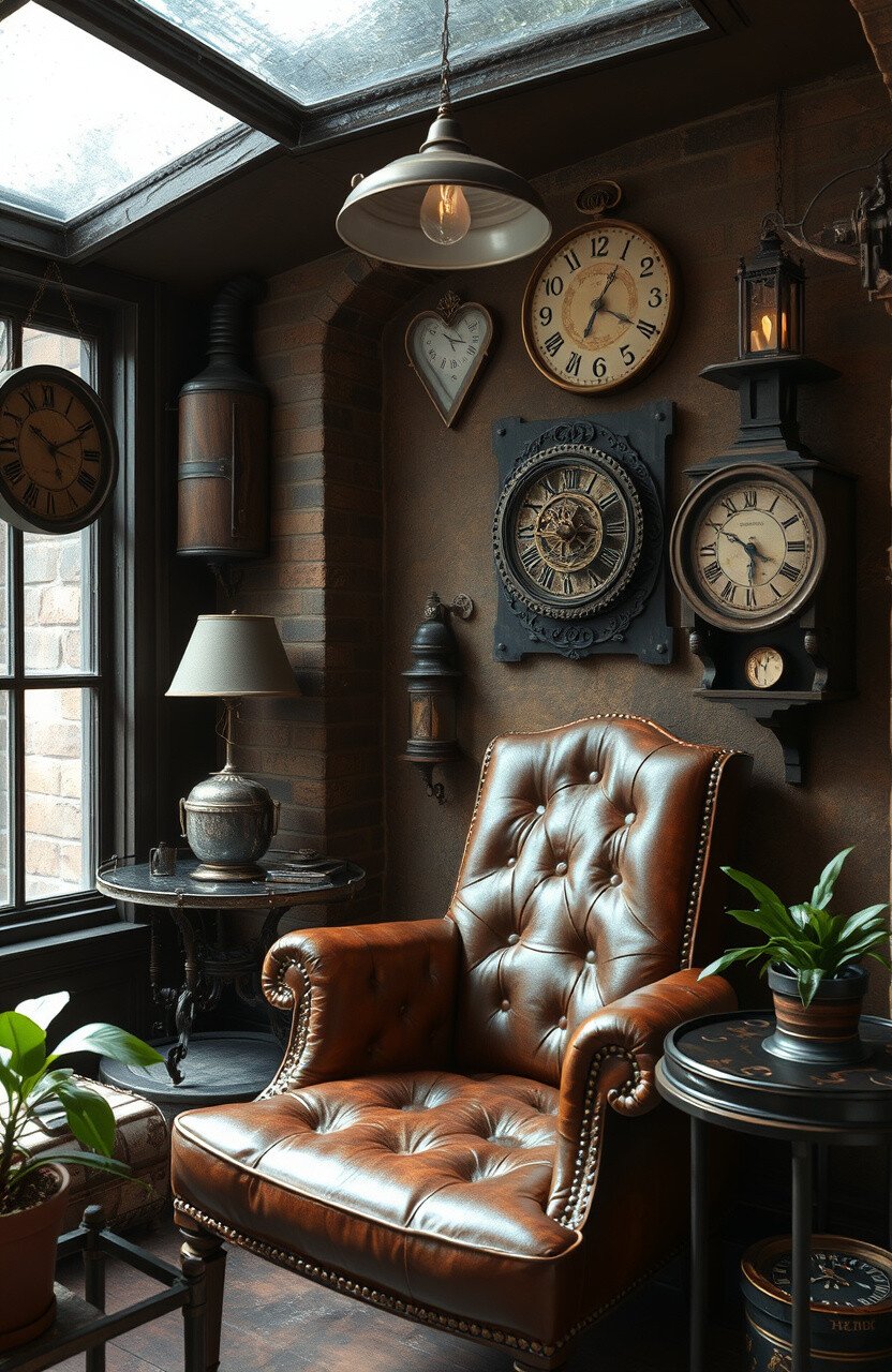 A steampunk fantasy nook features industrial materials and vintage decor. A leather chair and clockwork art add charm.