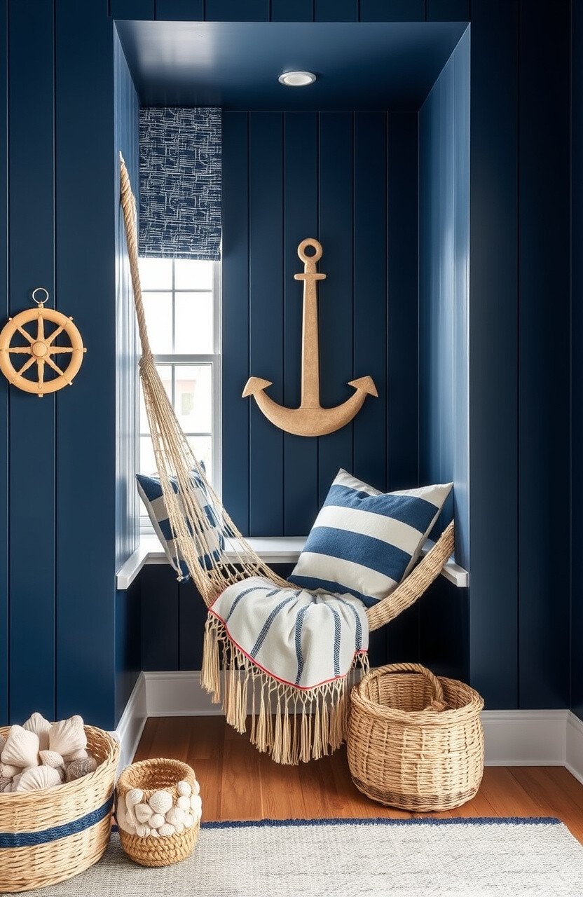 A nautical escape nook features navy blues and ship-themed decor. A rope hammock and seashells add charm.