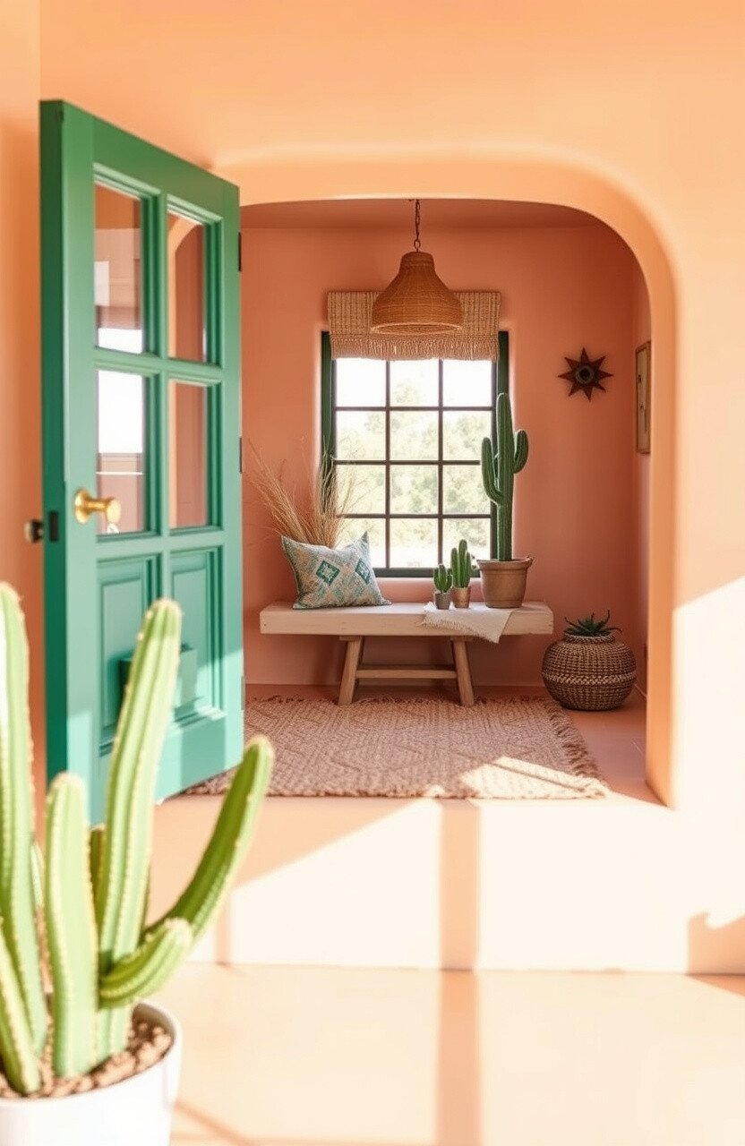 Southwest charm features warm colors and rustic materials. A woven rug and cactus decor add style.