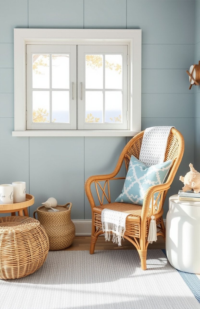 Embrace coastal vibes with light blues and sandy tones. A wicker chair and seashell decor bring the beach indoors.