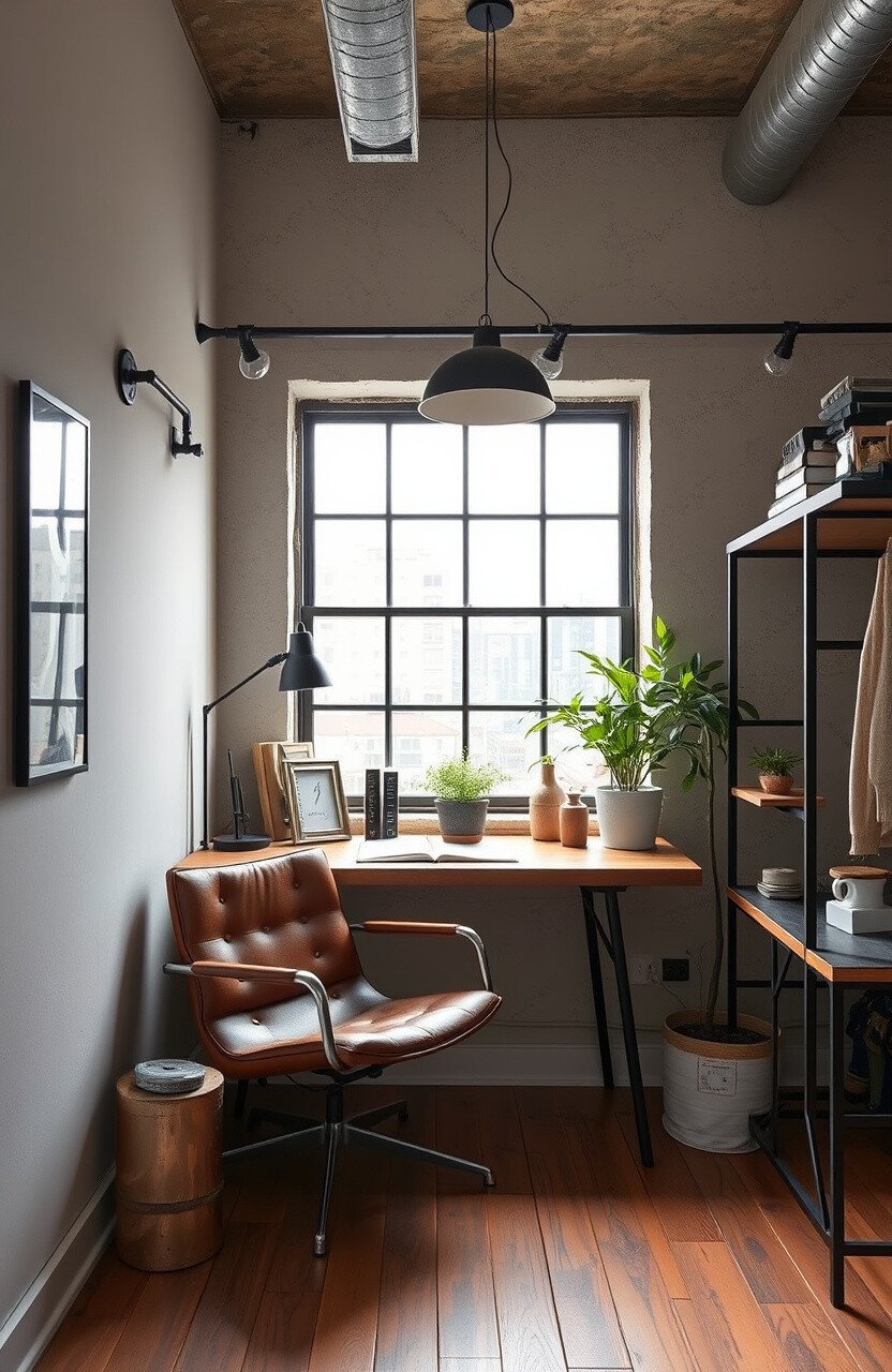 Modern industrial features raw materials and sleek finishes. A leather chair and metal accents add style.