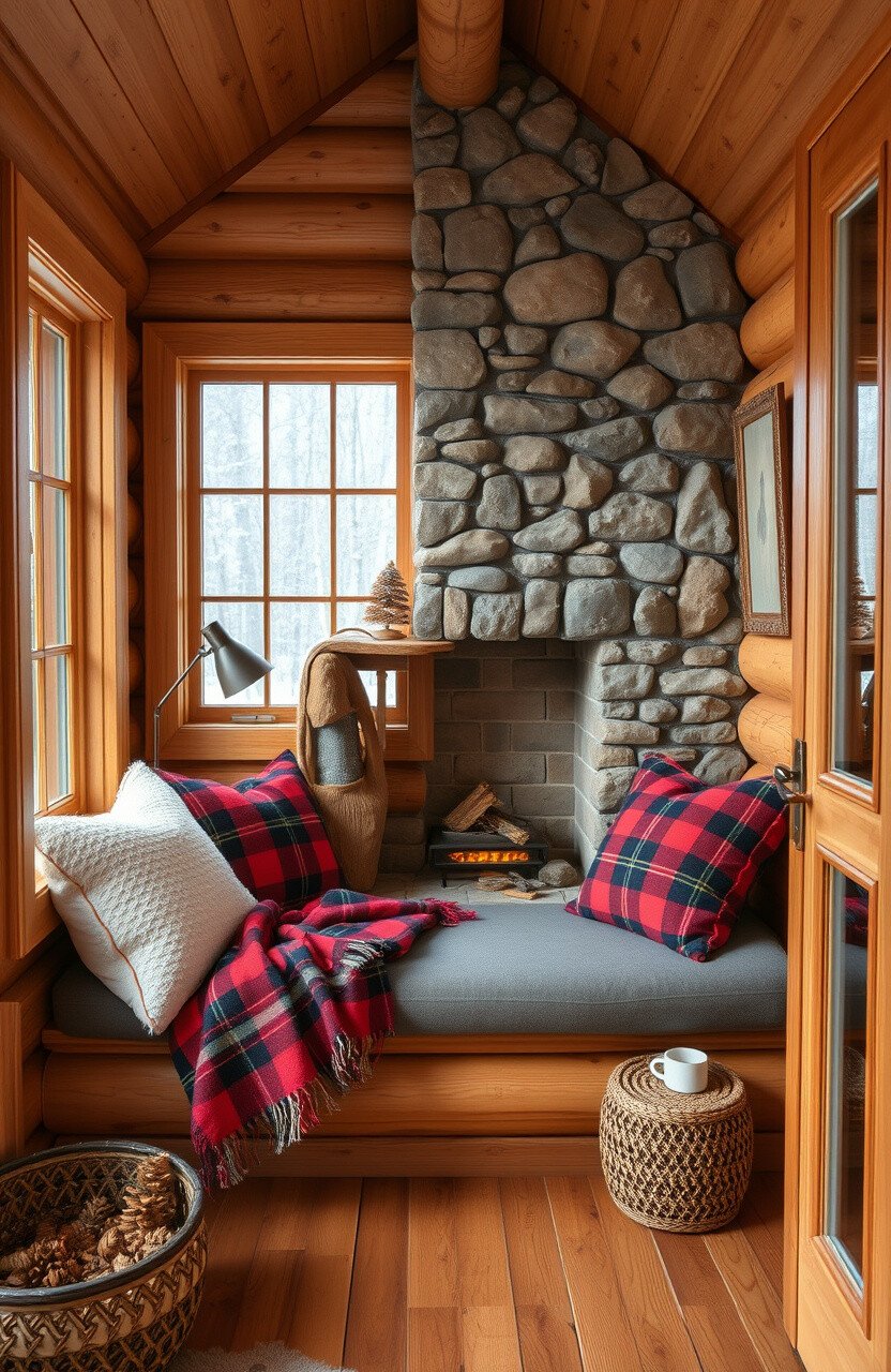 A cozy cabin nook features warm woods and soft fabrics. A plaid blanket and stone fireplace add charm.