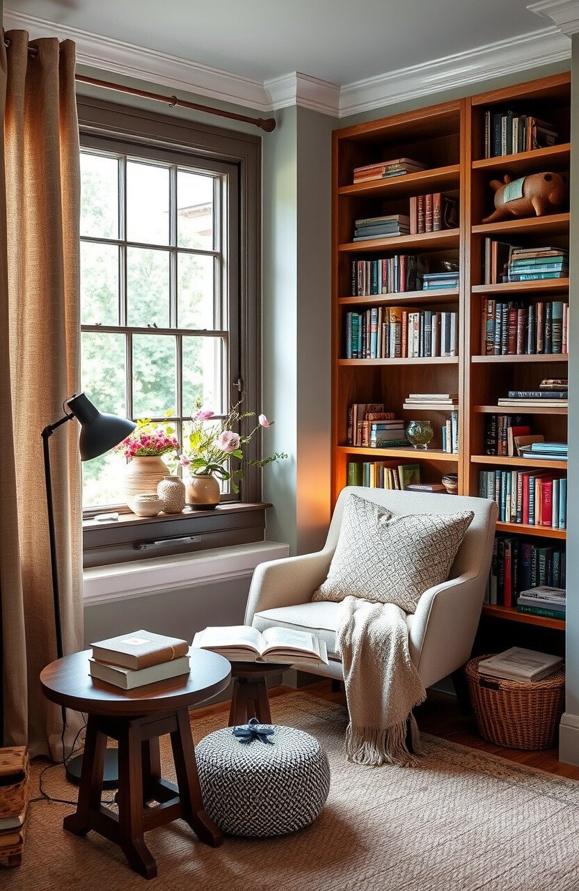 A cozy reading nook features soft fabrics and a comfy chair. A bookshelf and reading lamp add charm.