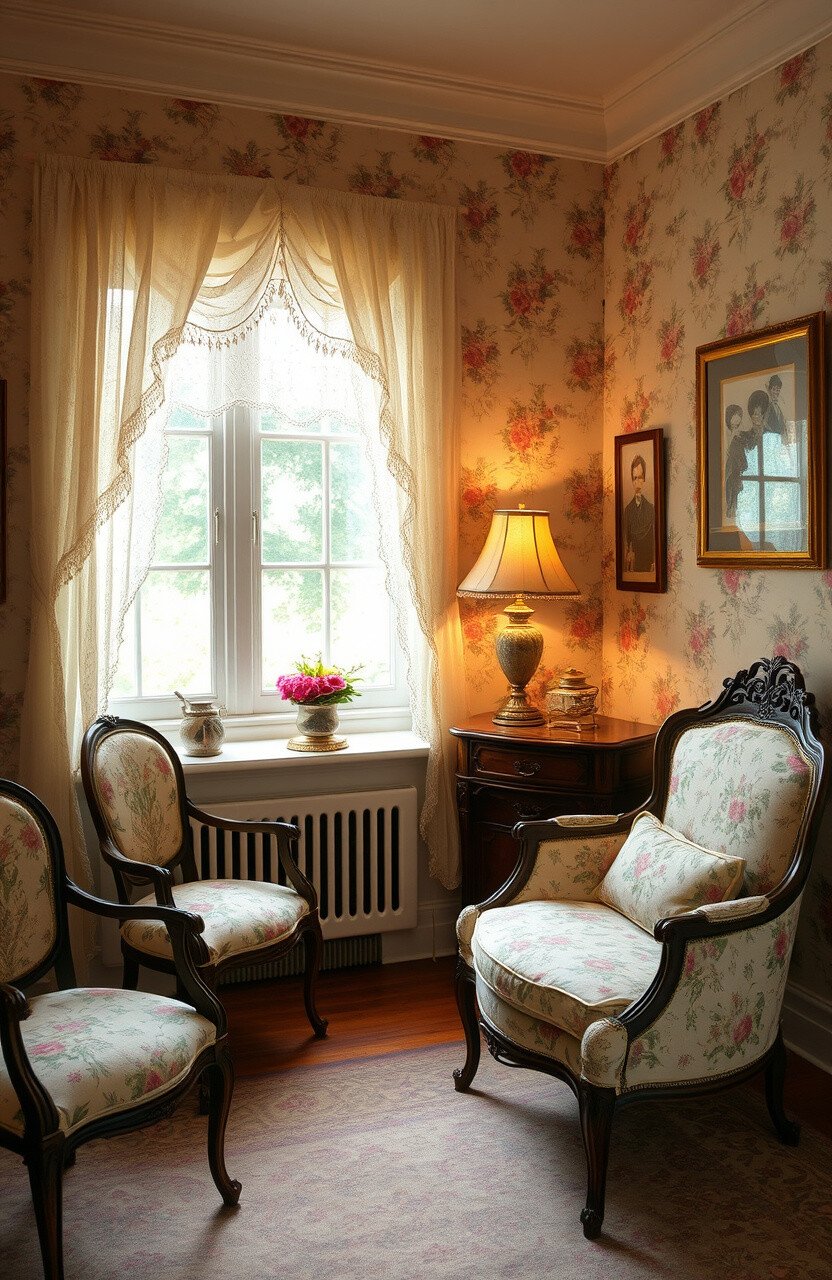 Use antique furniture and floral patterns for a vintage charm. Lace curtains and an old-fashioned lamp complete the look.