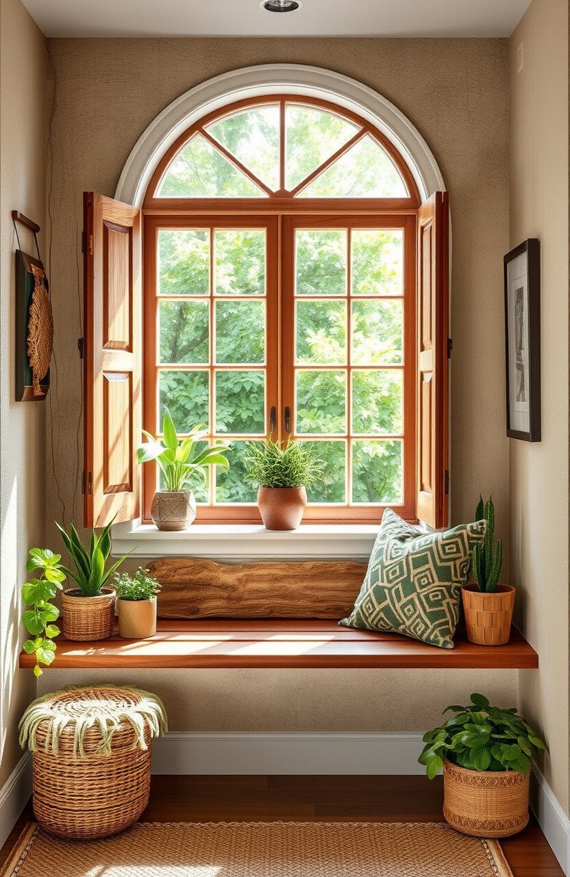 A nature-inspired nook features natural materials and earthy tones. A wooden bench and plant decor add charm.