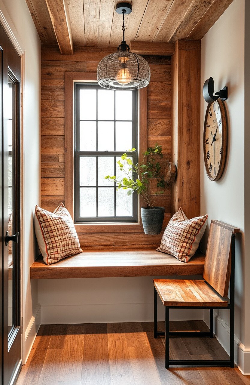 Modern rustic blends natural materials with sleek finishes. A wooden bench and metal accents add style.