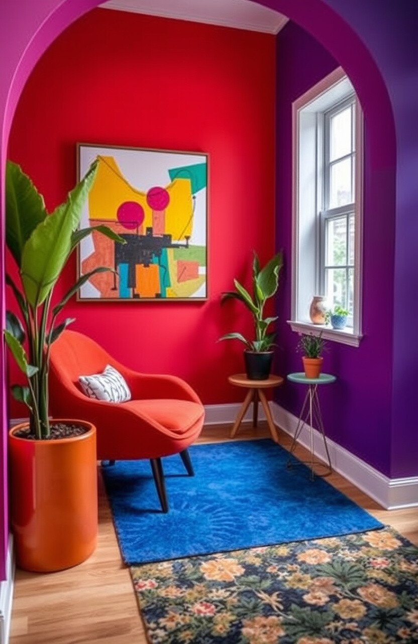An artistic expression nook features bold colors and eclectic decor. A statement chair and abstract art piece make it pop.