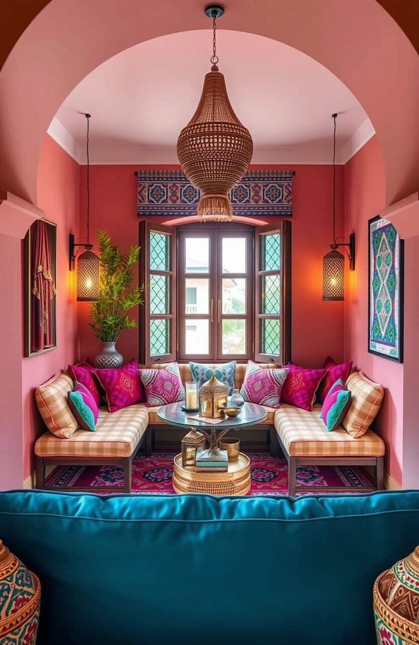 Use colorful textiles for a budget-friendly setup. Personalize with exotic decor or Moroccan crafts.