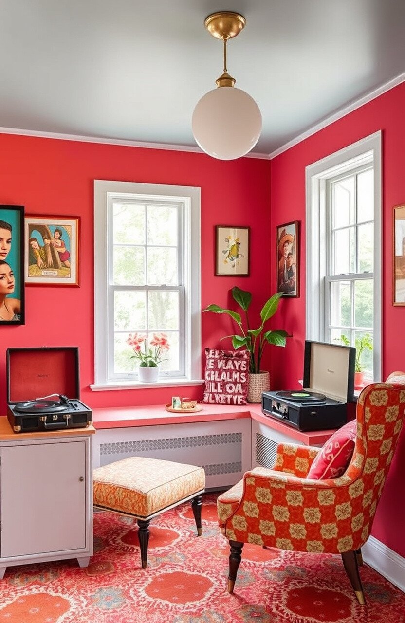 Embrace retro vibes with bold colors and funky patterns. A vintage armchair and record player add nostalgia.