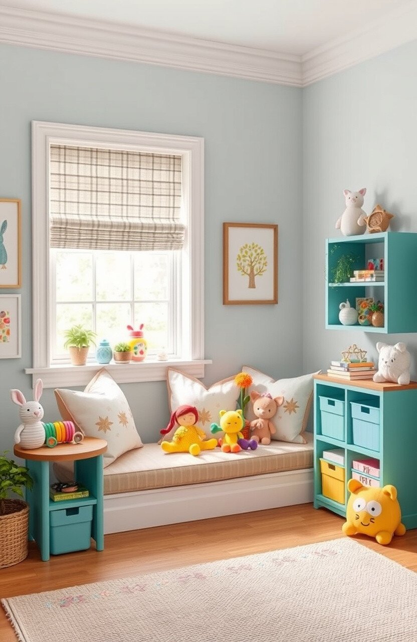 A family-friendly fun nook features playful decor and comfy seating. A large cushion and colorful toys add charm.