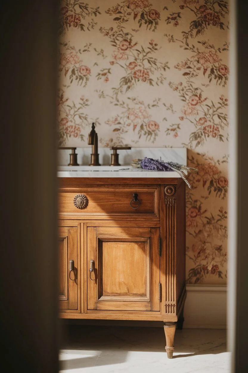 Consider adding some open shelving underneath for extra storage, where you can display pretty baskets or folded towels. This vanity style is perfect for those who love a cozy, lived-in feel.