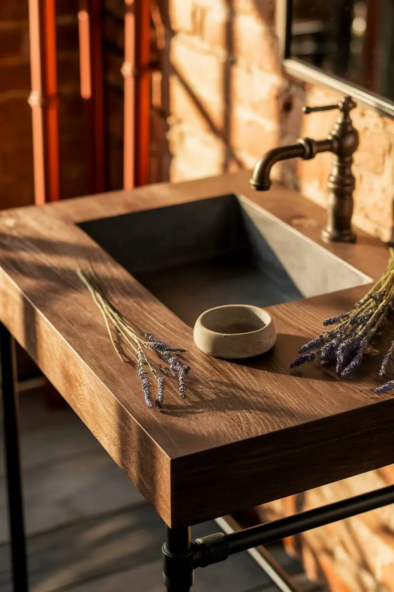 This look often features raw wood finishes paired with metal legs or hardware, giving it an urban, chic vibe. It’s a perfect match for modern lofts or urban-themed bathrooms.