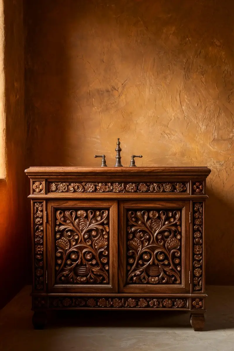 If you appreciate art, a carved wood vanity can be a stunning centerpiece in your bathroom. Intricate patterns and designs can elevate your space to a whole new level of elegance.