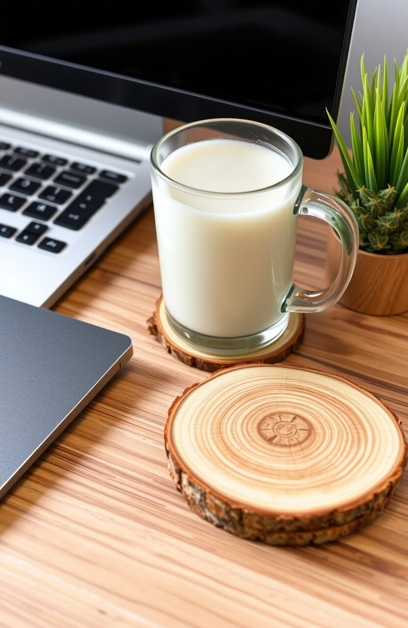 Wooden coasters protect your desk from spills. They add a rustic, natural look to your space.