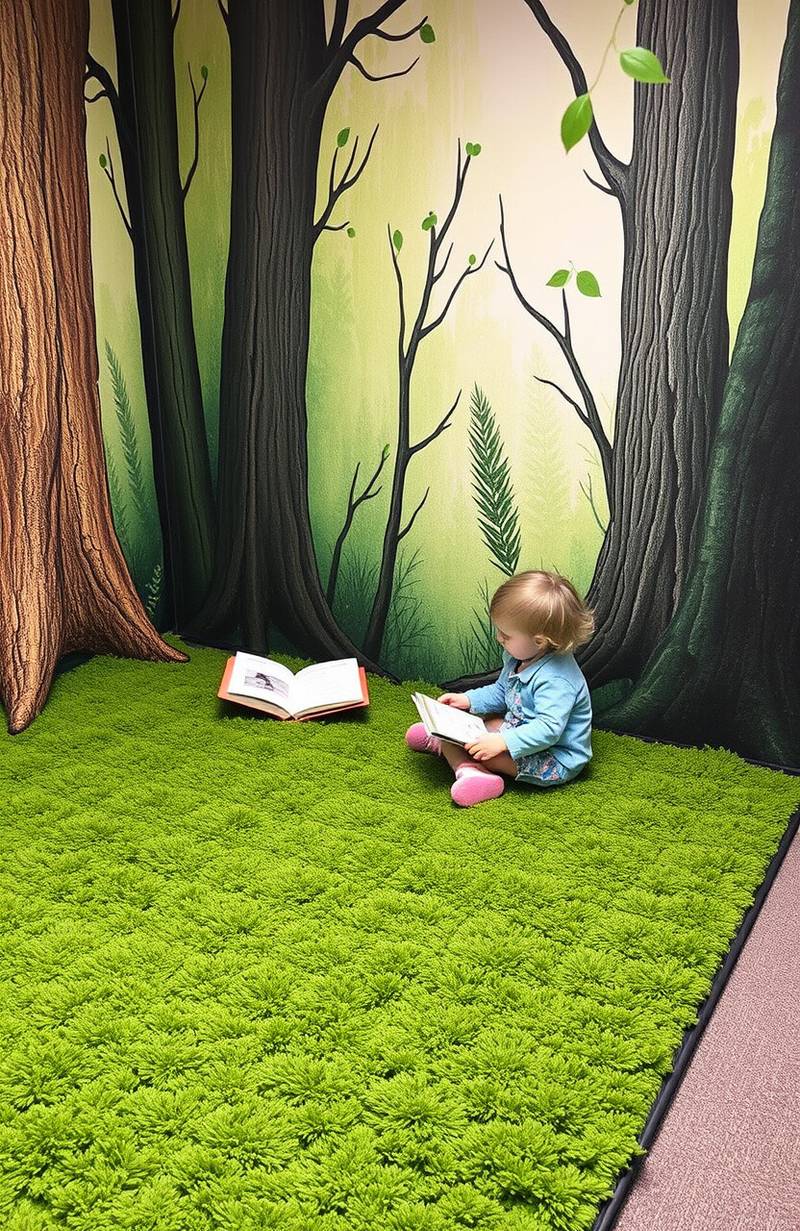 Set up a reading tent draped with leafy fabric, creating an intimate space for kids to read. It’s like a secret hideaway in the forest.
