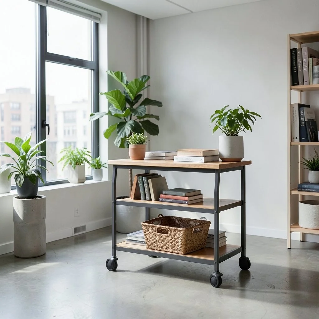 A rolling cart can hold supplies and still look stylish. It is like a small moving shelf that keeps things close by.