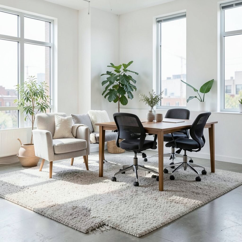 A rug can make a work area feel softer and more inviting. It also helps define a space, especially in shared rooms or home offices.