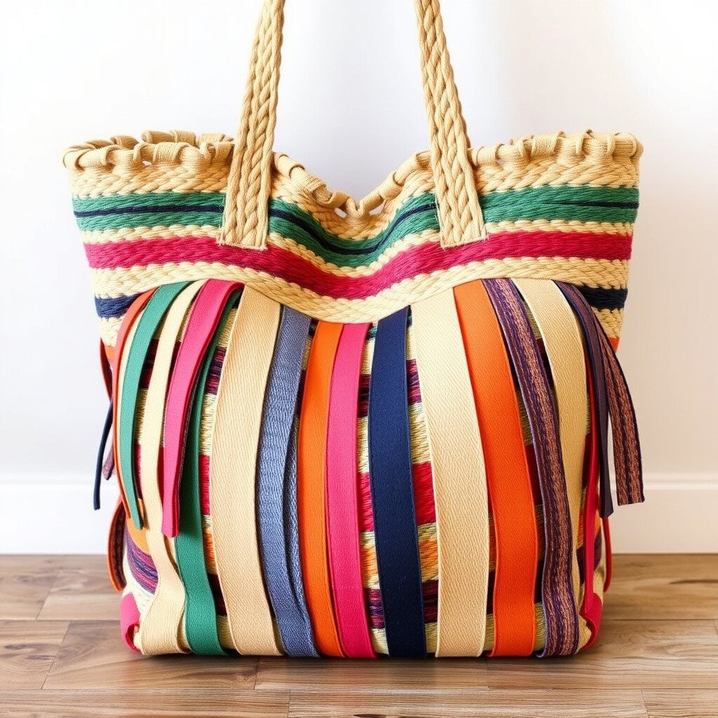 Carry your belongings in style with a tote bag made from woven fabric strips. This bag is not only sturdy but also a statement piece.